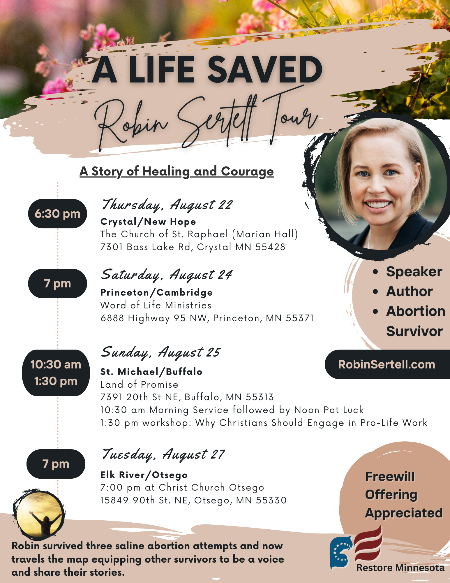 The survivor of three saline infusion abortion attempts, Chair of her local pro-life organization, and equipper of the saints. Her message creates awareness of the reality that babies survive abortions, and brings the healing forgiveness Christ died for.