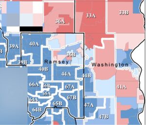90% of the MN counties vote Republican. But the big population counties vote Democrat. Let’s zoom in to the St. Paul area.